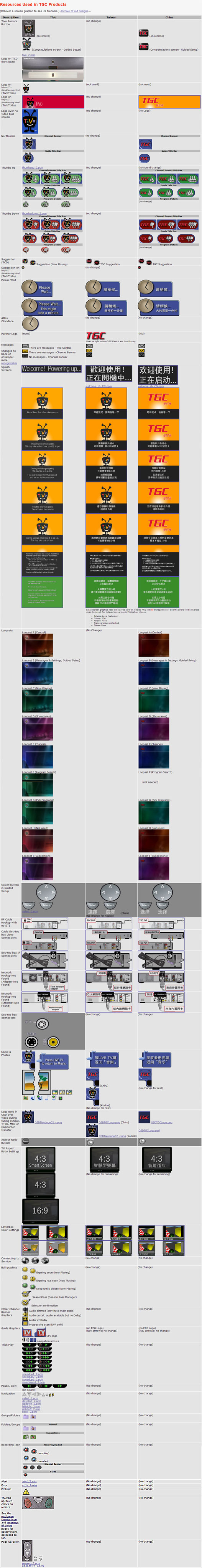 The following figure shows some of the graphics localization and branding I did – click the image to see all DVR elements. This image was taken from one of the internal webpages cataloging all the localizable elements, which was extremely useful as a reference as well as for marketing/documentation/implementation/testing. Similar localization/branding work was done on the "TGC Desktop" product for the PC.